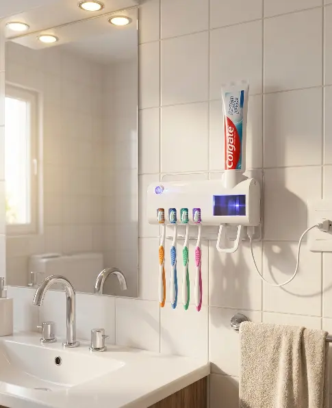 Higiene superior y orden total para tu baño. Este dispositivo inteligente no solo organiza tus cepillos, sino que utiliza tecnología de luz UV para eliminar hasta el 99.9% de bacterias y gérmenes. Además, incluye un dispenser automático de pasta dental para aprovechar cada pomo al máximo, todo sin necesidad de perforar la pared.